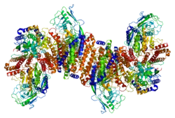 TfR1 is a transmembrane glycoprotein composed of two disulfide-linked monomers joined by two disulfide bonds. Each monomer binds one holo-transferrin molecule creating an iron-Tf-TfR complex which enters the cell by endocytosis.[9]