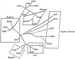 A phylogenetic tree was constructed for the orthologs that were analyzed in comparison to Homo sapiens. With the species of latest divergence being Rhincodon types, or the whale shark.[37][38]