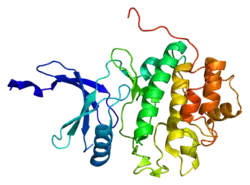 Checkpoint kinase 1, commonly referred to as Chk1, is a serine/threonine-specific protein kinase that, in humans, is encoded by the CHEK1 gene.[5][6] Chk1 coordinates the DNA damage response (DDR) and cell cycle checkpoint response.[7] Activation of Chk1 results in the initiation of cell cycle checkpoints, cell cycle arrest, DNA repair and cell death to prevent damaged cells from progressing through the cell cycle.