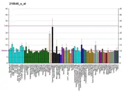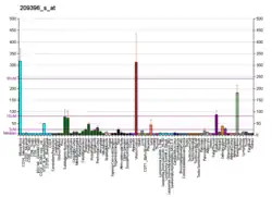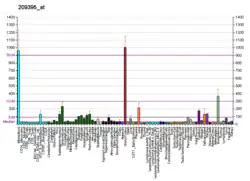 Chitinase-3-like protein 1 (CHI3L1), also known as YKL-40, is a secreted glycoprotein that is approximately 40kDa in size that in humans is encoded by the CHI3L1 gene.[5][6][7] The name YKL-40 is derived from the three N-terminal amino acids present on the secreted form and its molecular mass. YKL-40 is expressed and secreted by various cell-types including macrophages, chondrocytes, fibroblast-like synovial cells, vascular smooth muscle cells, and hepatic stellate cells. The biological function of YKL-40 is unclear. It is not known to have a specific receptor. Its pattern of expression is associated with pathogenic processes related to inflammation, extracellular tissue remodeling, fibrosis and solid carcinomas[8] and asthma.[9]