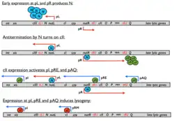 cII is first expressed after phage protein N reaches sufficient levels to antiterminate the early right transcript past tR1, allowing RNA polymerase to transcribe the cII gene.[10] If cII levels reach a certain threshold level, expression through the promoters pI, pRE and pAQ will be induced, initiating the two actions necessary in establishing lysogeny: 1) repression of lytic genes and 2) integration of the phage genome into the host's chromosome.[11] Activation of promoter pRE enables expression of the repressor protein cI, which shuts off all lytic genes. pRE activation is also accompanied with a ~2 fold drop in pR activity due to convergent transcription of the two promoters, decreasing the expression of the lytic genes O and P.[12] Activation of promoter pAQ produces the antisense RNA for Q, a key protein in the activation of the late lytic genes. Production of antisense Q RNA shuts off Q production, reducing lytic activity until the repressor cI can adequately shut off all lytic gene expression.[13] Activation of the promoter pI causes the expression of the phage protein Int, whose role is to integrate the phage genome into the host's chromosome.[3] Thus, although cII levels play a large role in determining the cell's fate, random thermal fluctuations also partially determine whether lysis or lysogeny is chosen.[4]