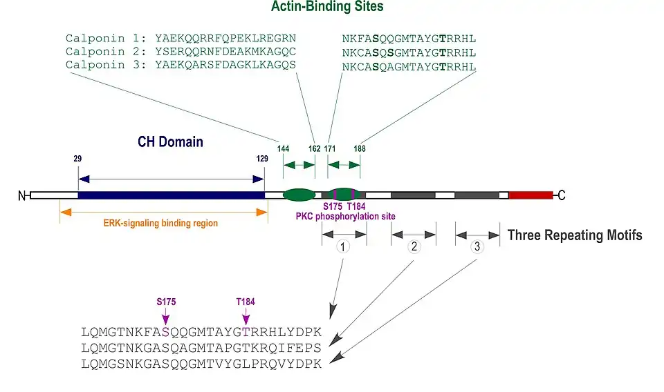 The CH domain was found in a number of actin-binding proteins (such as α-actinin, spectrin, and filamin) to form the actin-binding region or serve as a regulatory structure.[13] However, the CH domain in calponin is not the binding site for actin nor does it regulate the modes of calponin-F-actin binding.[14] Nonetheless, CH domain in calponin was found to bind to extra-cellular regulated kinase (ERK) for calponin to play a possible role as an adaptor protein in the ERK signaling cascades.[15]
