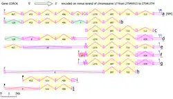 Alternative mRNAs are shown aligned from 5' to 3' on a virtual genome where introns have been shrunk to a minimal length. Exon size is proportional to length, intron height reflects the number of cDNAs supporting each intron. Introns of the same color are identical, of different colors are different. 'Good proteins' are pink, partial or not-good proteins are yellow, uORFs are green. 5' cap or3' poly A flags show completeness of the transcript . CORO6 contains 21 distinct gt-ag introns. Transcription produces 10 alternatively spliced mRNA. There are 3 probable alternative promoters, and validated alternative polyadenylation sites.[10]