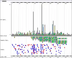 The COSMIC database contains thousands of somatic mutations that are implicated in the development of cancer. The database collects information from two major sources. Firstly, mutations in known cancer genes are collected from the literature. The list of genes that undergo manual curation are identified by their presence in the Cancer Gene Census.[10][11] Secondly, data for inclusion in the database is collected from whole genome resequencing studies of cancer samples undertaken by the Cancer Genome Project.[8] For example, Campbell and colleagues used next generation sequencing to examine samples from two individuals with lung cancer which led to the identification of 103 somatic DNA rearrangements.[12] COSMIC also catalogues mutational signatures in human cancer through the COSMIC Signatures group, which represents a collaboration between COSMIC, the Wellcome Sanger Institute, and the University of California, San Diego. The COSMIC signatures database has been leveraged to catalogue the prevalence of specific mutational signatures in human cancer, such as the frequency of ultraviolet radiation-mediated mutagenesis in skin cancers.[13]