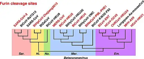 Another source of speculation is the mere presence of the furin cleavage site.[27][131] It is absent in the closest known relatives of SARS-CoV-2 (but present in other betacoronaviruses, e.g., BtHpCoV-ZJ13).[138] This anomaly is most probably the result of recombination,[131][139] and is further unsurprising since the genetic lineage of these viruses has not been adequately explored, sampled, or sequenced.[140][141] A common occurrence among other coronaviruses (including MERS-CoV, HCoV-OC43, HCoV-HKU1, and appearing in near-identical fashion in HKU9-1), the site is preceded by short palindromic sequences suggestive of natural recombination caused by simple evolutionary mechanisms. Additionally, the suboptimal configuration and poor targeting of the cleavage site for humans or mice when compared with known examples (such as HCoV-OC43 or HCoV-HKU1), along with the complex and onerous molecular biology work this would have required, is inconsistent with what would be expected from an engineered virus.[142]
