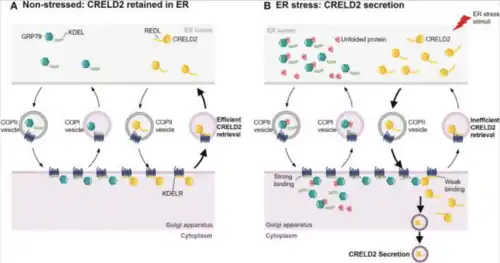 The CXXC motif at the N-terminal of CRELD2 suggests that it plays a role in the quality control of ER proteins. At the C-terminal, the four amino acids (R/H)EDL modulate the secretion of CRELD2. CRELD2 can bind to KDEL receptors in the Golgi and be retrogradely transported to the ER.[9] The presence of ER Stress Responsible Elements implies a regulatory role of CRELD2 during ER stress.[10] CRELD2 may function to promote ER stress tolerance or assist in recovery from acute stress.[11] The CRELD family is also implicated in developmental events.[7]