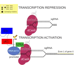 Transcriptional Activators are protein domains or whole proteins linked to dCas9 or sgRNAs that assist in the recruitment of important co-factors as well as RNA Polymerase for transcription of the gene(s) targeted by the system. In order for a protein to be made from the gene that encodes it, RNA polymerase must make RNA from the DNA template of the gene during a process called transcription. Transcriptional activators have a DNA binding domain and a domain for activation of transcription. The activation domain can recruit general transcription factors or RNA polymerase to the gene sequence. Activation domains can also function by facilitating transcription by stalled RNA polymerases, and in eukaryotes can act to move nucleosomes on the DNA or modify histones to increase gene expression.[4] These activators can be introduced into the system through attachment to dCas9 or to the sgRNA. Some researchers have noted that the extent of transcriptional upregulation can be modulated by using multiple sites for activator attachment in one experiment and by using different variations and combinations of activators at once in a given experiment or sample.[5][6][7]