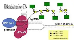A small guide RNA (sgRNA), or gRNA is an RNA with around 20 nucleotides used to direct Cas9 or dCas9 to their targets. gRNAs contain two major regions of importance for CRISPR systems: the scaffold and spacer regions. The spacer region has nucleotides that are complementary to those found on the target genes, often in the promoter region. The scaffold region is responsible for formation of a complex with (d)Cas9. Together, they bind (d)Cas9 and direct it to the gene(s) of interest. Since the spacer region of a gRNA can be modified for any potential sequence, they give CRISPR systems much more flexibility as any genes and nucleotides with a sequence complementary to the spacer region can become possible targets.[3]