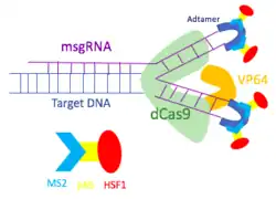 The dCas-SAM system uses msgRNA that has attached aptamers for different transcriptional factors (MS2,p65 and HSF1) to bind.