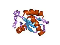 - ↑ Ostheimer GJ, Barkan A, Matthews BW (November 2002). "Crystal structure of E. coli YhbY: a representative of a novel class of RNA binding proteins". Structure. 10 (11): 1593–601. doi:10.1016/S0969-2126(02)00886-9. PMID 12429100.