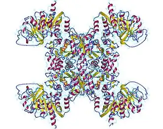 Active CTP synthase exists as a homotetrameric enzyme. At low enzyme concentrations and in the absence of ATP and UTP, CTP synthase exists as inactive monomer. As enzyme concentration increases, it polymerizes first to a dimer (such as the form shown to the left) and, in the presence of ATP and UTP, forms a tetramer.[5][9]