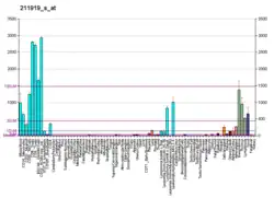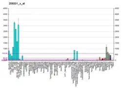 While CXCR4's expression is low or absent in many healthy tissues, it was demonstrated to be expressed in over 23 types of cancer, including breast cancer, ovarian cancer, melanoma, and prostate cancer. Expression of this receptor in cancer cells has been linked to metastasis to tissues containing a high concentration of CXCL12, such as lungs, liver and bone marrow.[18][19] However, in breast cancer where SDF1/CXCL12 is also expressed by the cancer cells themselves along with CXCR4, CXCL12 expression is positively correlated with disease free (metastasis free) survival. CXCL12 (over-)expressing cancers might not sense the CXCL12 gradient released from the metastasis target tissues since the receptor, CXCR4, is saturated with the ligand produced in an autocrine manner.[20] Another explanation of this observation is provided by a study that shows the ability of CXCL12 (and CCL2) producing tumors to entrain neutrophils that inhibit seeding of tumor cells in the lung.[21]