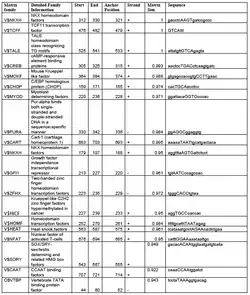 Through the use of Genomatix, a table was generated of the top 20 transcription factors and their binding sites in the CXorf66 promoter (see Figure IV).[19]
