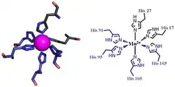 The first of the two calprotectin metal binding sites consists of a His3Asp motif, with S100A8 contributing two histidine ligands (His83 and His87), and S100A9 contributing a histidine and an aspartic acid ligand (His20 and Asp30).[9] The second site can coordinate metals through a tetra-histidine (His4) or a hexa-histidine (His6) binding motif. In the case of His4 binding, S100A8 coordinates through both His17 and His27 while S100A9 coordinates through His91 and His95.[9] In hexa-histidine binding two further histidine residues, His103 and His105, are recruited from the C-terminal end of S100A9 to enable octahedral coordination of the transition metal.[9] Manganese or iron are bound by the calprotectin dimer at this His6 site.[9][6] Zinc can be bound to either of the sites that form at the interface between S100A8 and S100A9 monomers.[9][19]