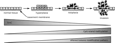 In somatic cells, patterns of DNA methylation are in general transmitted to daughter cells with high fidelity.[8] Typically, this methylation only occurs at cytosines that are located 5' to guanosine in the CpG dinucleotides of higher order eukaryotes.[9] However, epigenetic DNA methylation differs between normal cells and tumor cells in humans. The "normal" CpG methylation profile is often inverted in cells that become tumorigenic.[10] In normal cells, CpG islands preceding gene promoters are generally unmethylated, and tend to be transcriptionally active, while other individual CpG dinucleotides throughout the genome tend to be methylated. However, in cancer cells, CpG islands preceding tumor suppressor gene promoters are often hypermethylated, while CpG methylation of oncogene promoter regions and parasitic repeat sequences is often decreased.[11]