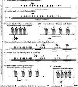 Cancer epigenetics is the study of epigenetic modifications to the DNA of cancer cells that do not involve a change in the nucleotide sequence, but instead involve a change in the way the genetic code is expressed. Epigenetic mechanisms are necessary to maintain normal sequences of tissue specific gene expression and are crucial for normal development.[1] They may be just as important, if not even more important, than genetic mutations in a cell's transformation to cancer. The disturbance of epigenetic processes in cancers, can lead to a loss of expression of genes that occurs about 10 times more frequently by transcription silencing (caused by epigenetic promoter hypermethylation of CpG islands) than by mutations. As Vogelstein et al. points out, in a colorectal cancer there are usually about 3 to 6 driver mutations and 33 to 66 hitchhiker or passenger mutations.[2] However, in colon tumors compared to adjacent normal-appearing colonic mucosa, there are about 600 to 800 heavily methylated CpG islands in the promoters of genes in the tumors while these CpG islands are not methylated in the adjacent mucosa.[3][4][5] Manipulation of epigenetic alterations holds great promise for cancer prevention, detection, and therapy.[6][7] In different types of cancer, a variety of epigenetic mechanisms can be perturbed, such as the silencing of tumor suppressor genes and activation of oncogenes by altered CpG island methylation patterns, histone modifications, and dysregulation of DNA binding proteins. There are several medications which have epigenetic impact, that are now used in a number of these diseases.