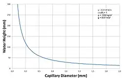 Thus for a 2 m (6.6 ft) radius glass tube in lab conditions given above, the water would rise an unnoticeable 0.007 mm (0.00028 in). However, for a 2 cm (0.79 in) radius tube, the water would rise 0.7 mm (0.028 in), and for a 0.2 mm (0.0079 in) radius tube, the water would rise 70 mm (2.8 in).