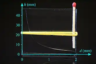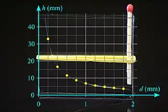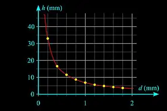 The product of layer thickness (d) and elevation height (h) is constant (d·h = constant), the two quantities are inversely proportional. The surface of the liquid between the planes is hyperbola.