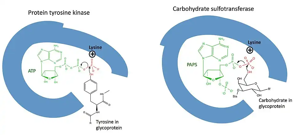 ![]() Figure 2: The mechanism by which carbohydrate sulfotransferase catalyzes the transfer of a sulfonyl group to a carbohydrate group in a glycoprotein or glycolipid is analogous to the mechanism by which a kinase catalyzes a phosphoryl group. Both enzymes use a lysine residue in their active sites to coordinate to their cosubstrates; the ATP cosubstrate in the kinase mechanism is analogous to the PAPS in the carbohydrate sulfotransferase mechanism (green). Red shows the group being transferred; note that the transfer is coordinated around the lysine. Black is the substrate. Sia stands for sialic acid.[6][9] |