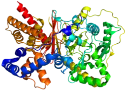 CROT is 612 amino acids long,[3] with a molecular weight of about 70 kDa.[2] In terms of broad overall structural features, CROT has 20 α-helices and 16 β-strands, and can be divided into two overall domains, named N and C.[3]