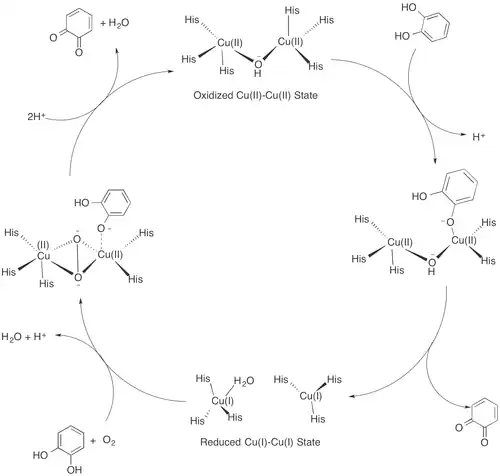 Although a crystal structure of catechol oxidase has been solved, questions concerning the exact mechanism of the reaction remain. One mechanism proposed by Eicken et al. is based on the crystal structure of catechol oxidase purified from Ipomoea batatas.[11] The catalytic cycle begins with the catechol oxidase in its native oxidized Cu(II)-Cu(II) state with a coordinated hydroxide ion bridging the two copper centers. As catechol enters the active site, a proton is abstracted from one of the alcohols. The catechol coordinates with a Cu(II) center in a monodentate fashion, displacing one of the coordinating histidine residues. The coordinated hydroxide ion abstracts another proton from catechol to form water, and the catechol is oxidized to o-quinone. The two resulting electrons reduce both copper centers to their Cu(I)-Cu(I) state. Dioxygen then binds one copper center, displacing the coordinated water molecule, and another molecule of catechol binds to the other copper center, displacing another histidine residue. This forms a complex in which one copper center has a tetragonal planar coordination with His240, His244 and the dioxygen molecule. The other copper center retains its initial tetragonal pyramidal geometry with dioxygen, His88 and His118 in the equatorial positions, and His109 in an axial position.[3] In this state, the enzyme active site is in a ternary catechol oxidase–O22−–catechol complex. Two electrons are transferred from the substrate to the dioxygen, followed by cleavage of the O–O bond. Water is released, and the second o-quinone product is formed together with the restoration of the initial Cu(II)-Cu(II) state to complete the catalytic cycle.[15]