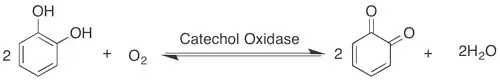 Polyphenol oxidases are a family of di-copper metalloenzymes that include tyrosinase and catechol oxidase.[4] In plants, both enzymes can catalyze the oxidation of ortho-diphenols substrates into their corresponding ortho-quinones. The key difference between the two related enzymes is that tyrosinase can catalyze the hydroxylation of monophenols to diphenols (monophenolase activity) as well as the oxidation of the o-diphenol to the o-quinone (diphenolase activity) whereas catechol oxidase only possesses diphenolase activity.[5]