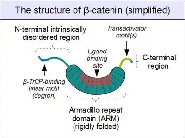 The segments N-terminal and far C-terminal to the ARM domain do not adopt any structure in solution by themselves. Yet these intrinsically disordered regions play a crucial role in β-catenin function. The N-terminal disordered region contains a conserved short linear motif responsible for binding of TrCP1 (also known as β-TrCP) E3 ubiquitin ligase – but only when it is phosphorylated. Degradation of β-catenin is thus mediated by this N-terminal segment. The C-terminal region, on the other hand, is a strong transactivator when recruited onto DNA. This segment is not fully disordered: part of the C-terminal extension forms a stable helix that packs against the ARM domain, but may also engage separate binding partners.[14] This small structural element (HelixC) caps the C-terminal end of the ARM domain, shielding its hydrophobic residues. HelixC is not necessary for β-catenin to function in cell–cell adhesion. On the other hand, it is required for Wnt signaling: possibly to recruit various coactivators, such as 14-3-3zeta.[15] Yet its exact partners among the general transcription complexes are still incompletely understood, and they likely involve tissue-specific players.[16] Notably, the C-terminal segment of β-catenin can mimic the effects of the entire Wnt pathway if artificially fused to the DNA binding domain of LEF1 transcription factor.[17]