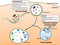 Autophagy is cytoplasmic, characterized by the formation of large vacuoles that eat away organelles in a specific sequence prior to the destruction of the nucleus.[17] Macroautophagy, often referred to as autophagy, is a catabolic process that results in the autophagosomic-lysosomal degradation of bulk cytoplasmic contents, abnormal protein aggregates, and excess or damaged organelles. Autophagy is generally activated by conditions of nutrient deprivation but has also been associated with physiological as well as pathological processes such as development, differentiation, neurodegenerative diseases, stress, infection and cancer.