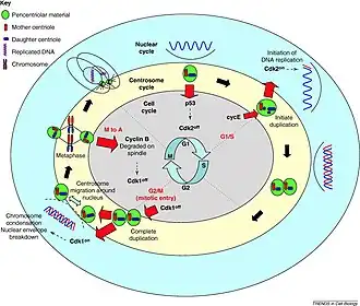- ↑ Stearns, T. (May 2001). "Centrosome duplication. A centriolar pas de deux". Cell. 105 (4): 417–420. doi:10.1016/S0092-8674(01)00366-X. ISSN 0092-8674. PMID 11371338. S2CID 1622118.