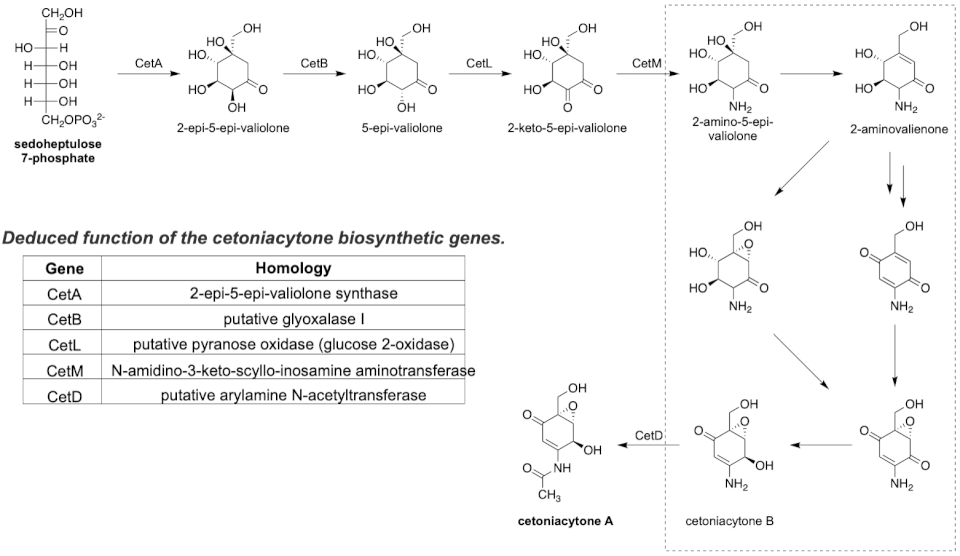 Feeding experiments conducted by Zeeck and co-workers established the synthesis of cetoniacytone A to proceed via the pentose phosphate pathway with sedoheptulose 7-phosphate as the key intermediate.[2] Sedoheptulose 7-phosphate first undergoes a cyclization catalyzed by 2-epi-5-epi-valiolone synthase (CetA) yielding 2-epi-5-epi-valiolone. Following the cyclization, 2-epi-5-epi-valiolone epimerase (CetB) results in an inversion of the stereochemistry of the alcohol alpha to the ketone forming 5-epi-valiolone. Next, CetL, a type of oxidoreductase, results in the oxidation of the C-4 hydroxyl group to give 2-keto-5-epi-valiolone followed by a transamination catalyzed by aminotransferases CetM to give 2-amino-5-epi-valiolone. The sequential reactions depicted in the dashed box represent putative pathways that involve oxidoreductase, dehydrogenase, and hypothetical proteins related to the cupin superfamily to yield cetoniacytone B. Lastly, cetoniacytone B is acetylated via an arylamine N-acetyltransferase (CetD) to yield cetoniacytone A.[3]