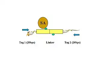 - Figure 3. The linker fragments are ligated on the ChIP beads under dilute conditions. The purified DNA is then digested by MmeI, which cuts at a distance from its recognition site to release the tag-linker-tag structure.