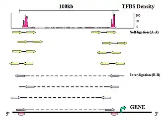 The ChIA-PET method combines ChIP-based methods,[2] and Chromosome conformation capture (3C) based methods,[3] to extend the capabilities of both approaches. ChIP-Sequencing (ChIP-Seq) is a popular method used to identify transciption factor binding sites (TFBS) while 3C has been used to identify long-range chromatin interactions. Independently, both suffer from limitations in identifying de-novo long-range interactions genome wide. While ChIP-Seq is able to identify TFBS genome-wide,[4][5] it provides only linear information of protein binding sites along the chromosomes (but not interactions between them), and can suffer from high genomic background noise (false positives). While 3C is capable of analyzing non-linear, long-range chromatin interactions, it cannot be used genome wide and, like ChIP-Seq, also suffers from high levels of background noise. Since the noise increases in relation to the distance between interacting regions (max 100kb), laborious and tedious controls are required for accurate characterization of chromatin interactions.[6] Unlike 3C which is a locus-specific interaction profiling method, alternative methods such as Hi-C have been established to profile interactions genome wide.[7] Despite whole genome profiling methods for both TFBS and long range interactions, combining approaches with the ChIA-PET method allows for identification of genomic areas in which the protein of interest is bound as well as the genomic region which it interacts with.[8][9]
