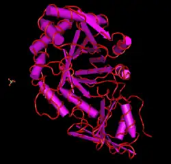 The protein translation of CHID1 is typically about 400 amino acids long (though this varies within the many known forms), and has few post-translational modifications.[13] In most forms and orthologs, it is predicted that CHID1 has a signal peptide that varies in length by sequence.[14] Structure predictions and x-ray crystallography structures of CHID1 indicate that its secondary structure is heavy in alpha helices, though it definitely has some beta strands present, as indicated by the SI-CLP x-ray crystallography structure. CHID1 is also a member of the GH18 superfamily of proteins, which has a unique conserved structure.[15] Members of this family contain an 8 stranded beta/alpha barrel. This protein is also shown to interact with other copies of itself in a homodimer, which also uses sulfate ion interacting molecules for an unknown purpose.