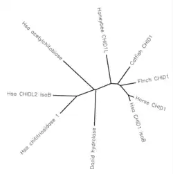 There are also several proposed paralogs to CHID1. These genes are di-N-acetylchitobiase, Chitinase-3-like protein 2, and chitotriosidase 1. All of these genes have roughly 40% similarity, and match human transcripts of CHID1 over 40-50% of the gene.[12] Based on the level of conservation, these paralogs all likely split at a time near to the split from bacteria.