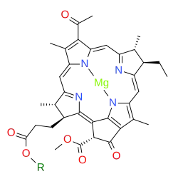 Bacteriochlorophylls are the light harvesting pigments found in photosynthetic bacteria: they do not produce oxygen as a side-product. There are many such structures but all are biosynthetically related by being derived from chlorophyllide a.[1][16]