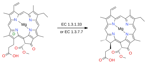 This is followed by the reaction EC 1.3.1.33 in which the pyrrole ring D is reduced by the enzyme protochlorophyllide reductase[11]