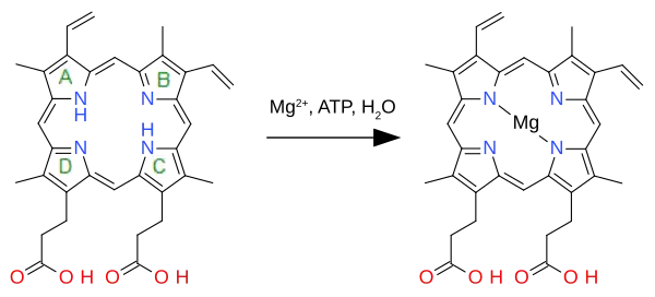 Chlorophyll is characterised by having a magnesium ion coordinated within a ligand called a chlorin. The metal is inserted into protoporphyrin IX by the enzyme magnesium chelatase[1] which catalyzes the reaction EC 6.6.1.1