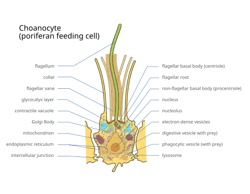 They make up the choanoderm, a type of cell layer found in sponges. The cell has the closest resemblance to the choanoflagellates which are the closest related single celled protists to the animal kingdom (metazoans). The flagellae beat regularly, creating a water flow across the microvilli which can then filter nutrients from the water taken from the collar of the sponge. Food particles are then phagocytosed by the cell.[3]