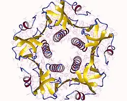 ![]() 3D structure of cholera toxin subunit B. (top view with CTA subunit removed) | |||||||