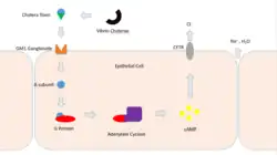 This dramatically increases intracellular 3′,5′-cyclic AMP (cAMP) levels, activating protein kinase A (PKA). PKA phosphorylates and activates CFTR chloride channels, promoting the secretion of Cl⁻, HCO₃⁻, Na⁺, and water into the intestinal lumen. Additionally, the uptake of Na⁺ and water by enterocytes is inhibited, resulting in the hallmark profuse watery diarrhoea (up to 1–2 litres per hour), contributing to severe dehydration and electrolyte imbalance in cholera patients.[4][20]