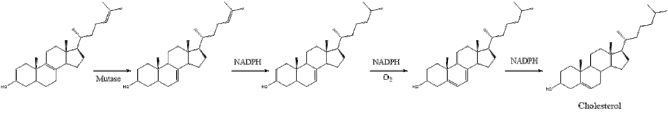 Finally, lanosterol is converted to cholesterol via either of two pathways, the Bloch pathway, or the Kandutsch-Russell pathway.[41][42][43][44][45] The final 19 steps to cholesterol contain NADPH and oxygen to help oxidize methyl groups for removal of carbons, mutases to move alkene groups, and NADH to help reduce ketones.