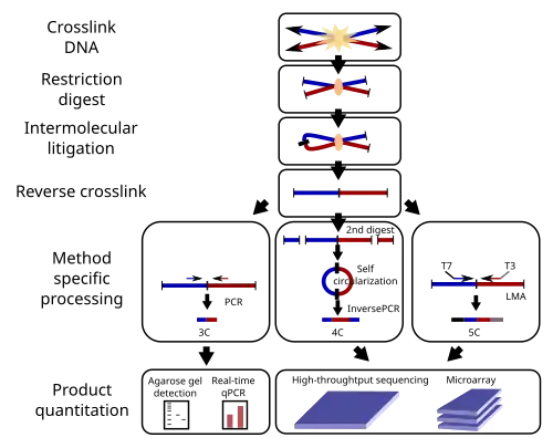 - 1 2 3 4 5 6 7 Hakim O, Misteli T (March 2012). "SnapShot: Chromosome confirmation capture". Cell. 148 (5): 1068.e1–2. doi:10.1016/j.cell.2012.02.019. PMC 6374129. PMID 22385969.