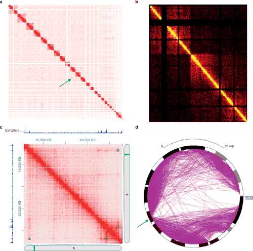 - 1 2 Lieberman-Aiden E, van Berkum NL, Williams L, Imakaev M, Ragoczy T, Telling A, et al. (October 2009). "Comprehensive mapping of long-range interactions reveals folding principles of the human genome". Science. 326 (5950): 289–93. Bibcode:2009Sci...326..289L. doi:10.1126/science.1181369. PMC 2858594. PMID 19815776.