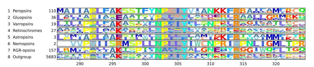 Most chromopsins have also the retinal binding lysine except the nemopsins, where it is replaced by argenine (R), and the gluopsins, where it is replaced by glutamic acid (E). The astropsins, the nemopsins and the gluopsins are highlighted by the frames. The outgroup contains other G protein-coupled receptors including the other opsins.
