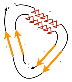 Schematic representation of a circular permutation in two proteins. The first protein (outer circle) has the sequence a-b-c. After the permutation the second protein (inner circle) has the sequence c-a-b. The letters N and C indicate the location of the amino- and carboxy-termini of the protein sequences and how their positions change relative to each other.