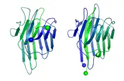 Two proteins that are related by a circular permutation. Concanavalin A (left), from the Protein Data Bank (PDB: 3cna), and peanut lectin (right), from PDB: 2pel, which is homologous to favin. The termini of the proteins are highlighted by blue and green spheres, and the sequence of residues is indicated by the gradient from blue (N-terminus) to green (C-terminus). The 3D fold of the two proteins is highly similar; however, the N- and C- termini are located on different positions of the protein.[1]