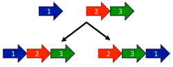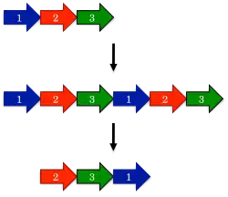 The earliest model proposed for the evolution of circular permutations is the permutation by duplication mechanism.[1] In this model, a precursor gene first undergoes a duplication and fusion to form a large tandem repeat. Next, start and stop codons are introduced at corresponding locations in the duplicated gene, removing redundant sections of the protein.