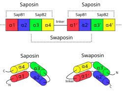 Suggested relationship between saposin and swaposin. They could have evolved from a similar gene.[7] Both consist of four alpha helices with the order of helices being permuted relative to each other.