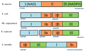An example for the fission and fusion mechanism can be found in nicotinamide nucleotide transhydrogenases.[20] These are membrane-bound enzymes that catalyze the transfer of a hydride ion between NAD(H) and NADP(H) in a reaction that is coupled to transmembrane proton translocation. They consist of three major functional units (I, II, and III) that can be found in different arrangement in bacteria, protozoa, and higher eukaryotes. Phylogenetic analysis suggests that the three groups of domain arrangements were acquired and fused independently.[12]