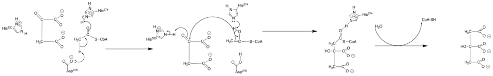 Citrate synthase has three key amino acids in its active site (known as the catalytic triad) which catalyze the conversion of acetyl-CoA [H3CC(=O)−SCoA] and oxaloacetate [−O2CCH2C(=O)CO2−] into citrate [−O2CCH2C(OH)(CO2−)CH2CO2−] and H−SCoA in an aldol condensation reaction. The citrate product is said to be prochiral.[10] This conversion begins with the negatively charged carboxylate side chain oxygen atom of Asp-375 deprotonating acetyl CoA's alpha carbon atom to form an enolate anion which in turn is neutralized by protonation by His-274 to form an enol intermediate [H2C=C(OH)−SCoA]. At this point, the epsilon nitrogen lone pair of electrons on His-274 formed in the last step abstracts the hydroxyl enol proton to reform an enolate anion that initiates a nucleophilic attack on the oxaloacetate's carbonyl carbon [−O2CCH2C(=O)CO2−] which in turn deprotonate the epsilon nitrogen atom of His-320. This nucleophilic addition results in the formation of citroyl−CoA [−O2CCH2CH(CO2−)CH2C(=O)−SCoA]. At this point, a water molecule is deprotonated by the epsilon nitrogen atom of His-320 and hydrolysis is initiated. One of the oxygen's lone pairs nucleophilically attacks the carbonyl carbon of citroyl−CoA. This forms a tetrahedral intermediate and results in the ejection of −SCoA as the carbonyl reforms. The −SCoA is protonated to form HSCoA. Finally, the hydroxyl added to the carbonyl in the previous step is deprotonated and citrate [−O2CCH2C(OH)(CO2−)CH2CO2−] is formed.[11]